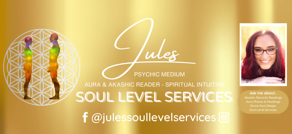 “Jules is an experienced Aura Reader – Akashic Reader, Spiritual Intuitive, Psychic Medium – Akashic Past Life Reader – Divine Soul Design Creator, Soul Realignment Practitioner and Holistic Counsellor who supports others in their journey of personal transformation .”